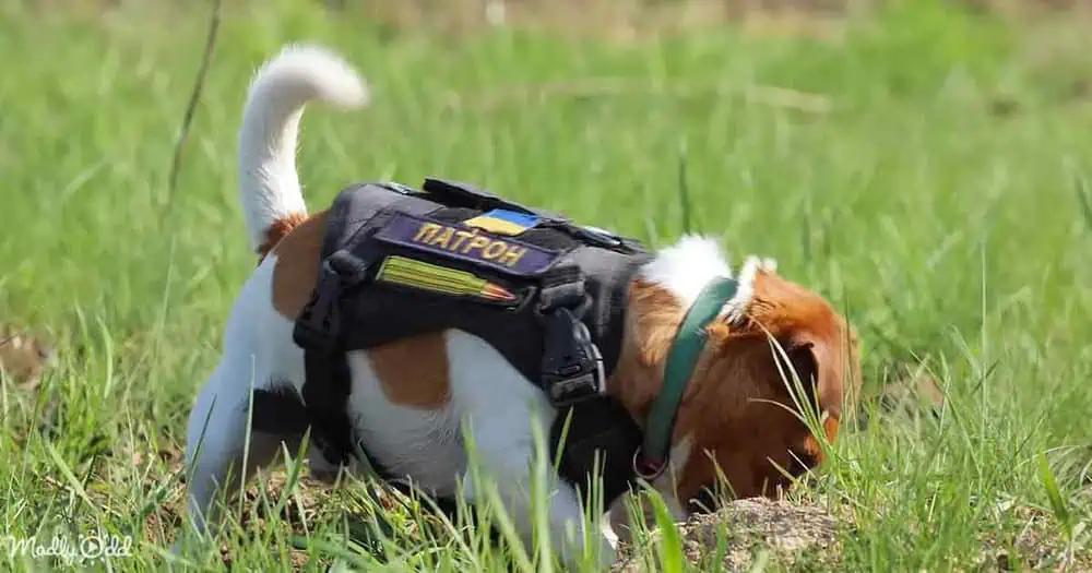 When the full-scale invasion began, Ukraine’s need for demining efforts became critical. Vast areas were littered with unexploded ordnance, hidden dangers lurking beneath fields, in abandoned buildings, and along roadsides. This is where Patron stepped up. Weighing just under 9 pounds, he was perfectly suited for the task. His light weight means he won’t detonate landmines as larger dogs or humans might, allowing him to safely identify explosive devices.